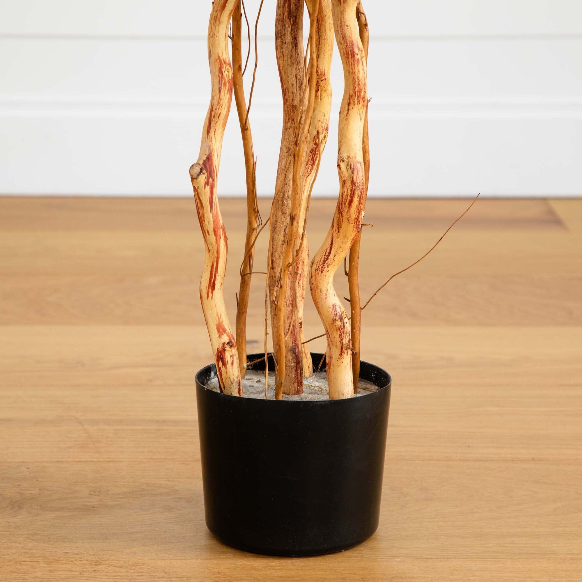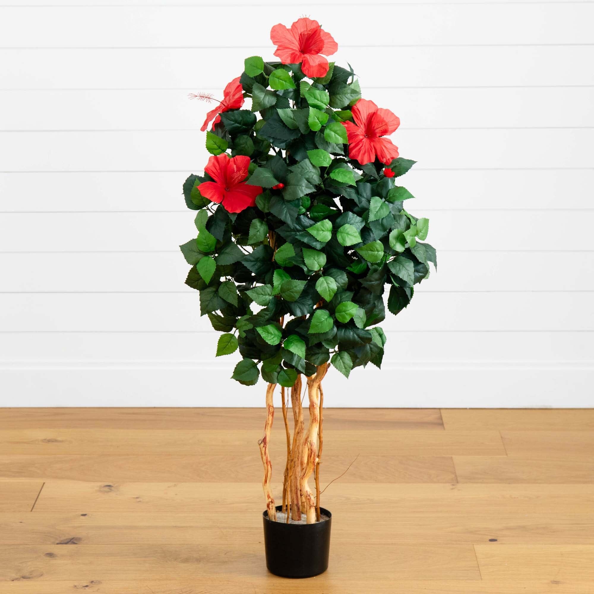 The hibiscus tree is one of our favorite flowering trees. Because in full bloom. the mixture of colors and textures is unlike any other tree. This perfect recreation captures a 4' tall Hibiscus tree in bloom. with unique "gnarly" trunks twisting upwards. an explosion of lush greenery. and pretty hibiscus flowers. It's an ideal home or office decoration. and as a bonus. will stay looking perfect with nary a drop of water. Makes a thoughtful gift as well.