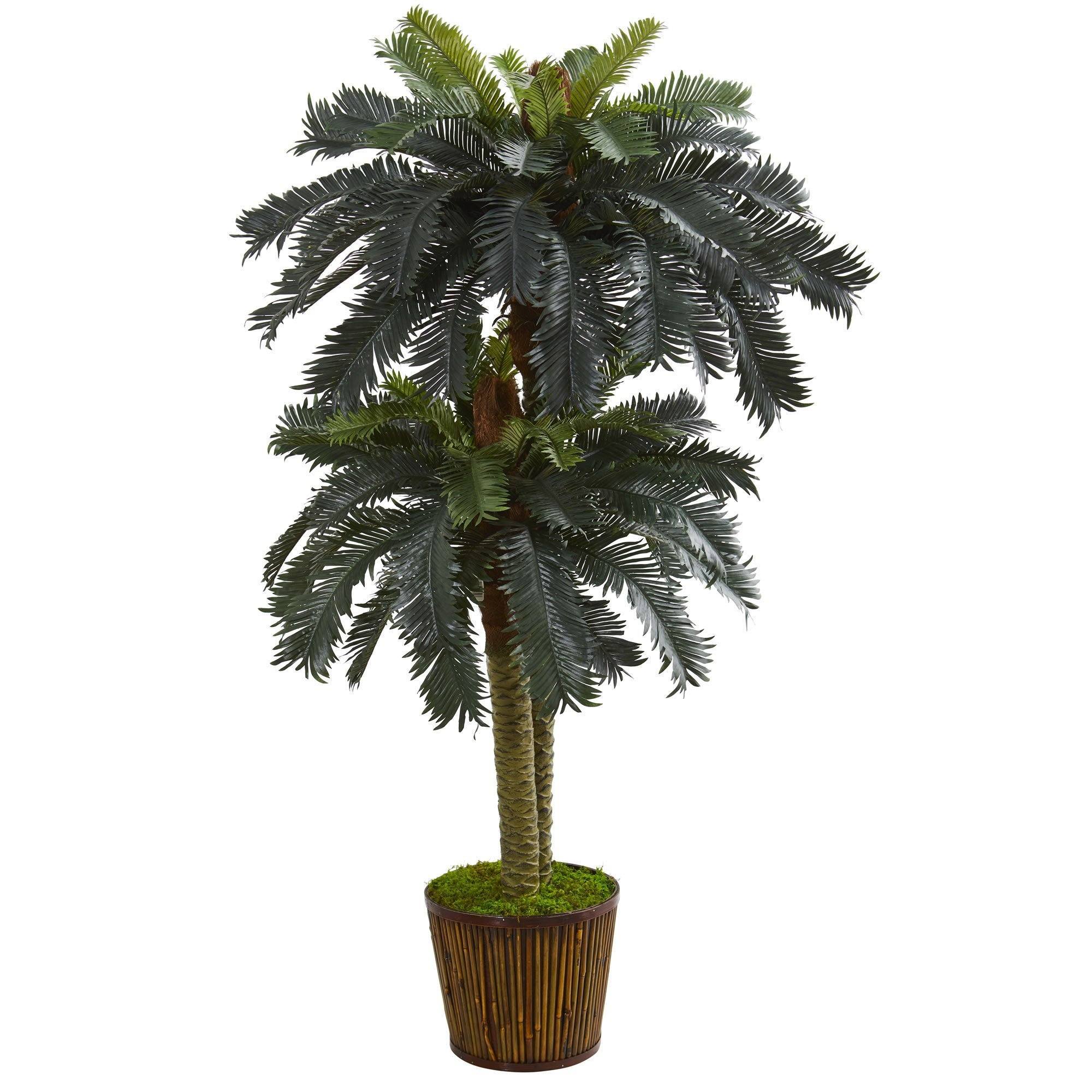 The rich green foliage and natural moss at the base of this artificial double sago palm tree make it the perfect addition for anyone looking to bring a piece of nature indoors. With a natural-looking bamboo planter. this 5.5-foot tree would be a great addition to an entry or a sitting room.