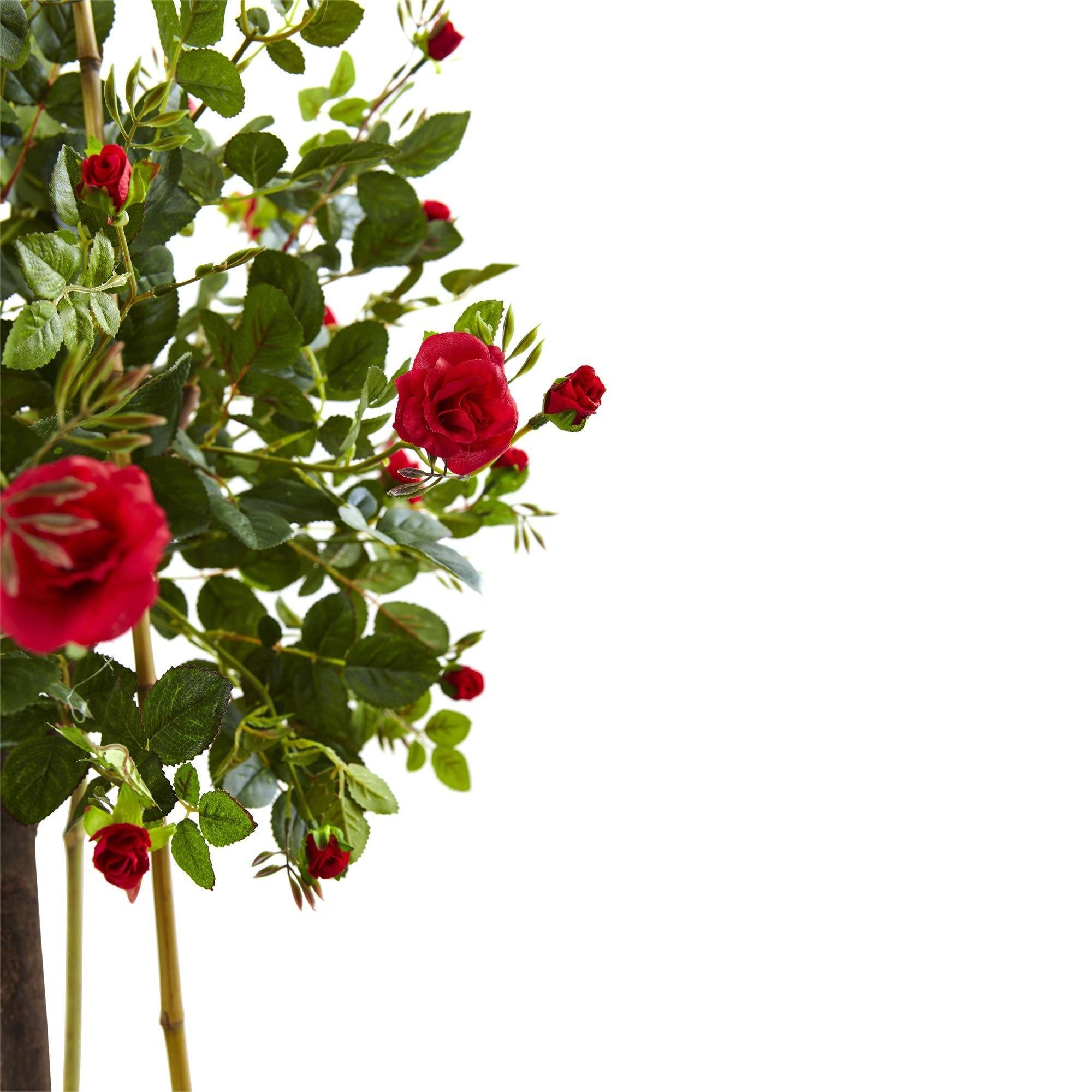 There is an elegant. yet rustic. feel to this tall artificial rose topiary in a farmhouse barrel planter. With two balls of red roses and realistic leaves. this could be the finishing touch on a polished dining area. A pair of rose topiaries also make a dramatic first impression at your entryway.
