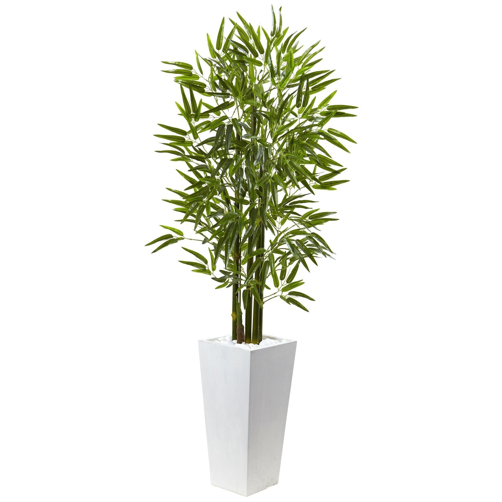 The UV resistant leaves of this 5' bamboo tree make it perfect for indoor and outdoor use. Their slender shape and green color blend in well with the green bamboo poles. These sturdy poles are rooted in white river rocks. Comes in a white. square planter.