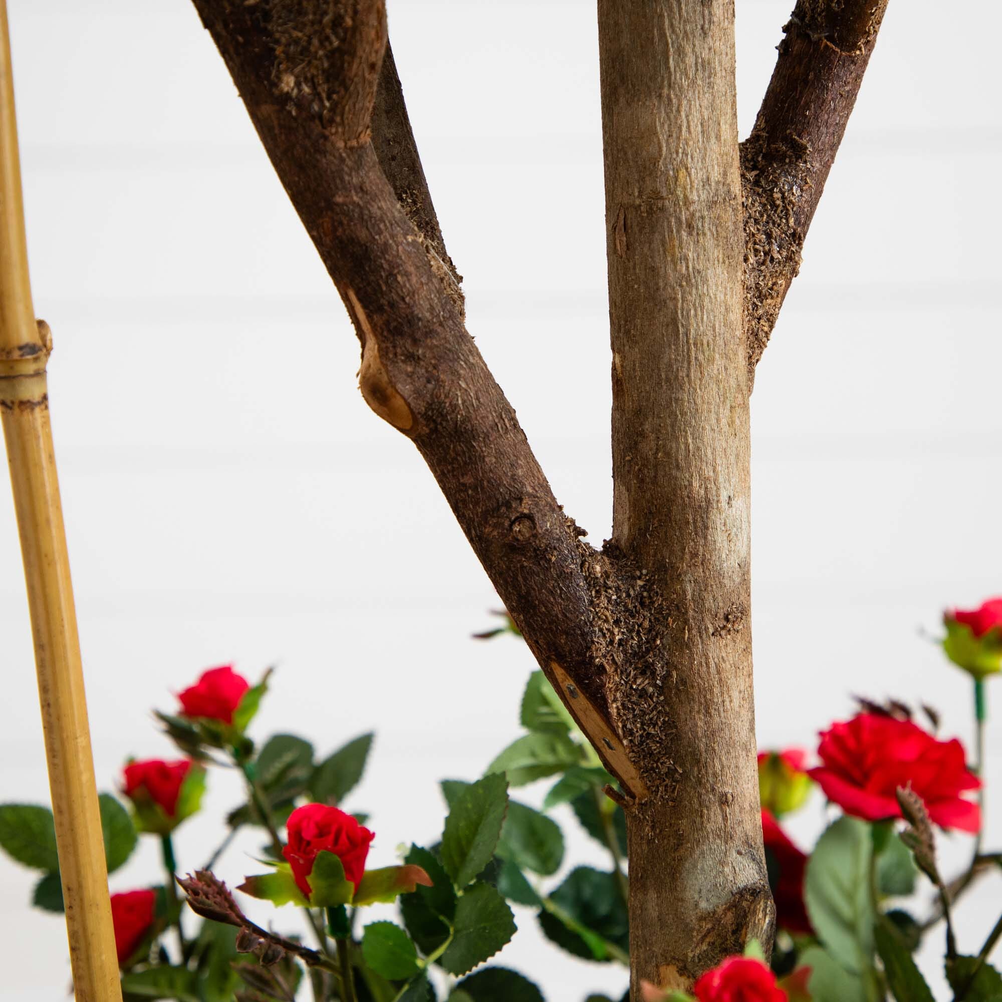 Rose enthusiasts will adore this topiary style mini-rose silk tree. With its popular double ball pattern. this elegant work of art is a refreshing change from traditional topiary shrubs. Dainty delicately crafted crimson petals and fresh miniature buds fill each sphere shaped bloom. A full 5' high. this enchanting beauty makes a bold statement despite its feminine charm and appeal.