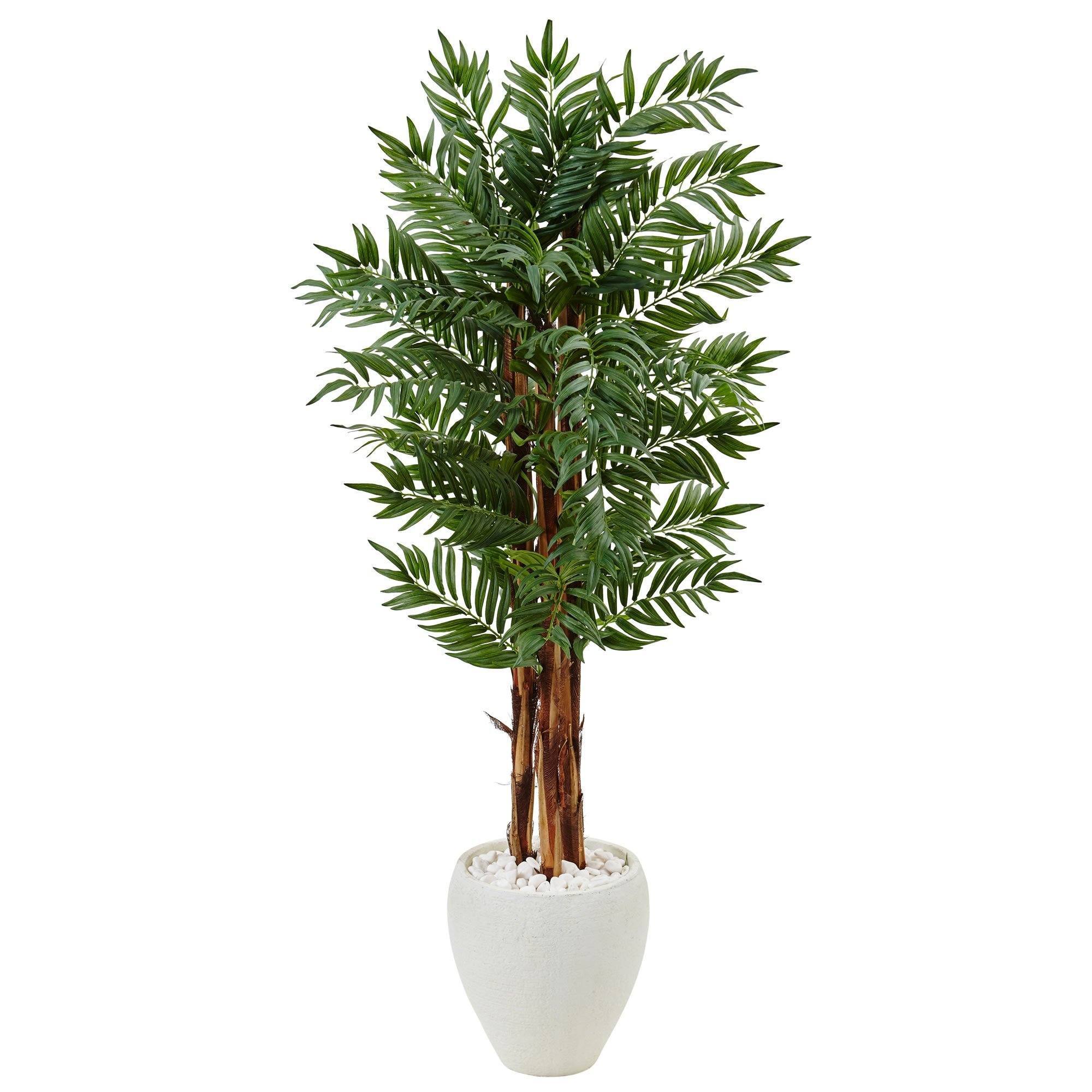 This parlor palm tree looks like it took years to grow with its realistic leaves fanning out above multiple. sturdy trunks. The minimalist white oval planter comes included. and round river rocks complete the look. This faux palm is ready to add some lush. tropical flair to your den or office.