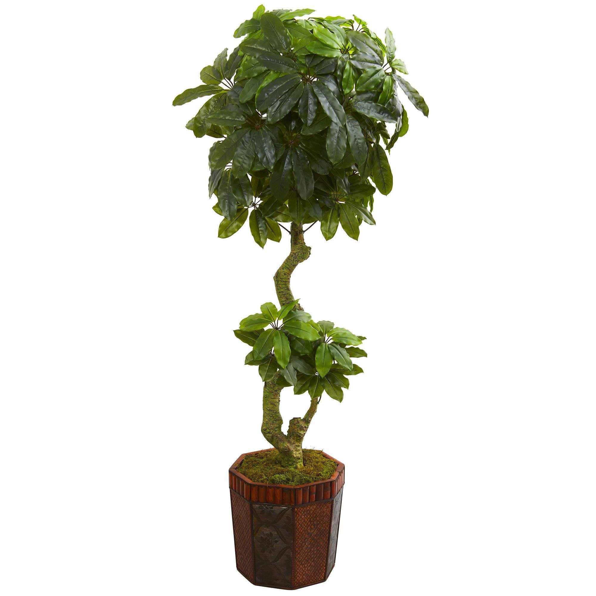 With a sophisticated bamboo planter with natural green moss included. this UV-resistant artificial schefflera tree is the perfect piece to bring a touch of nature indoors. It has two beds of rich. vibrant green leaves--with the bigger of the two sitting above the smaller one on a single stalk. At a height of 6 feet. it's one piece that you can't help but look at. whether it be indoors near an entryway or placed outside on either side of a front door.