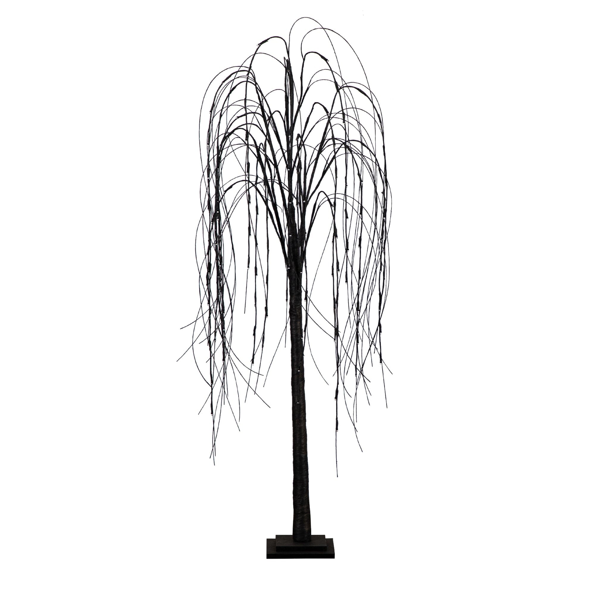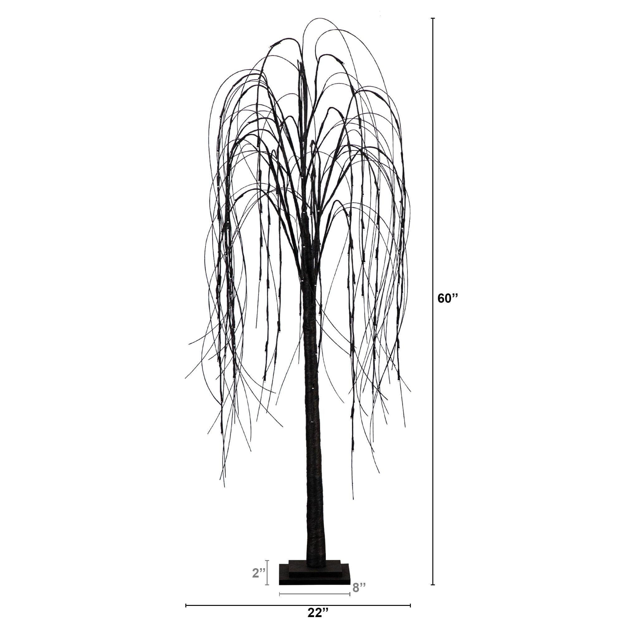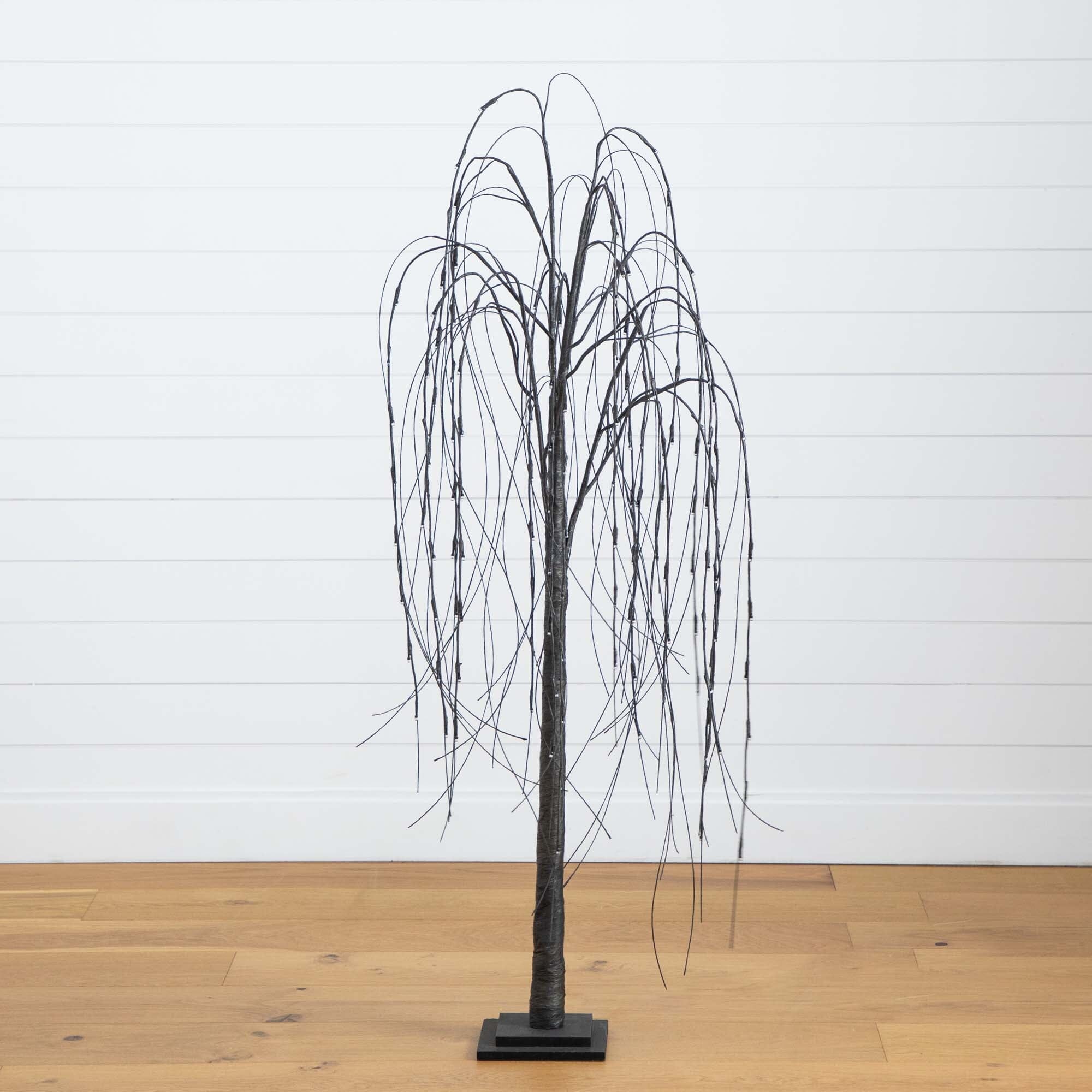Welcome the scary season with this Halloween-inspired willow tree that'll delight any goblin. If you want a custom look. you can shape the branches. just like brushing a witch's hair. to make them resemble a long black draping mane. 144 multicolored pre-strung LED lights create a cozy show and you can alternate between purple and orange lights by pressing a button on the plug-in base. This creates a spooky feel perfect for your dream haunted house. The LED lights create a centerpiece that sets the mood for a hauntingly delightful atmosphere and the shaping is your hocus pocus time to shine. The energy-efficient lights save you both time and money on the electric bill. Standing 5' from a sturdy black base. it adds an eerie and enchanting touch to any space. Decorate with other accents such as wreaths. spiders of pumpkins.